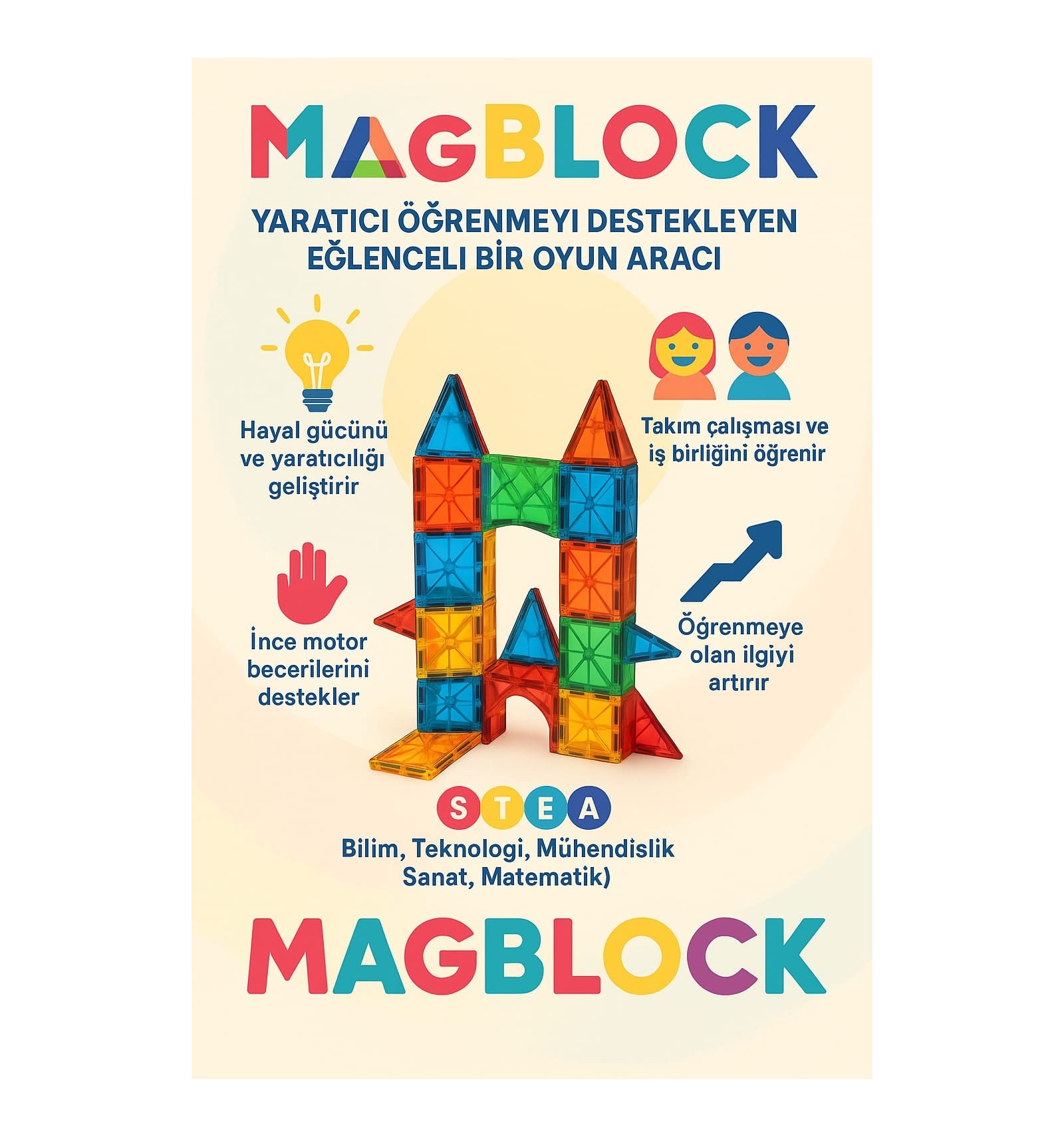 Çocuğunuzun canlı renklere sahip manyetik yapı taşlarını benzersiz desenlerle birleştirerek, hayal ettikleri her şeyi inşa edebilir.Gökdelen kalelerden hızlı arabalara ve soyut heykellere, MagBlocks ile çocuğunuzun yaratıcı ve yapıcı yeteneklerinin sınırsız potansiyelini ortaya çıkarın! MagBlocks Manyetik bloklarımız çocukların bilim, matematik ve mühendislik yapmak ve teknolojiyi verimli kullanmak için gerekli STEM becerilerini geliştirmelerine yardımcı olur.